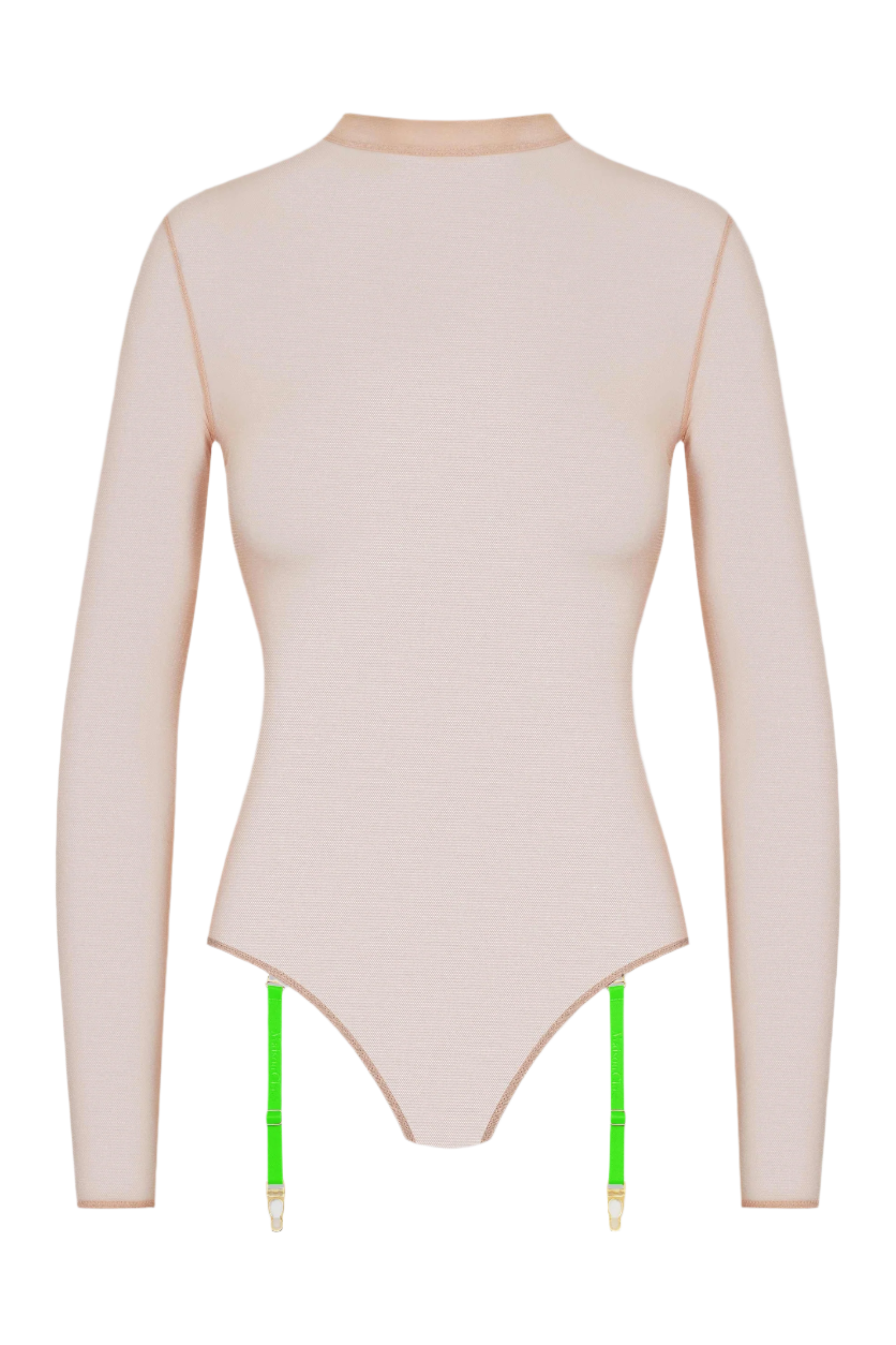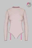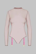 Transparent nude mesh body thong with a form-fitting cut and a gentle second skin effect. Long sleeves and collar complete the piece.