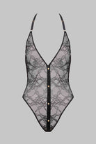 Sheer stretch lace bodysuit. Opens front to back with magnetic gold press-studs. V-neck and plunging back.