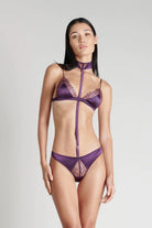 An iconic marriage of incredibly fine eyelash lace and deep purple satin. This poetic collection with delicate transparency sketches arabesques on the skin while offering the promise of being daring.